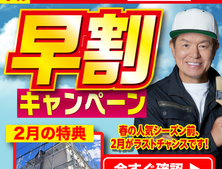 春の事前予約受付中|2月中のご予約で早割特典のご案内 外壁塗装・屋根塗装をご検討中の皆さまへ。 春の塗装シーズンに向けた「早割キャンペーン」のご案内です。 春は、外壁塗装・屋根塗装を行ううえで、気候が安定しやすく人気の高い季節です。そのため毎年、春の施工枠は早い段階で埋まりやすい傾向があります。 そこで当社では、春施工を予定されている方が、余裕をもって準備できるように、2月中の事前予約を対象としたキャンペーンをご用意しました! 春の人気シーズン前、2月がひとつの目安です 「工事は春にやりたいけれど、まだ早いかな?」 そう感じる方もいらっしゃるかもしれません。 しかし実際には、 現地調査 劣化状況の確認 見積内容の検討 工事時期の調整 といった工程を考えると、春施工の場合、2月頃からの準備がちょうど良いタイミングになります。 春の人気シーズン直前になると、ご希望の時期でのご案内が難しくなることもあるため、早めのご相談・ご予約がおすすめです! 【2月の特典】早割キャンペーンについて 今回のキャンペーンでは、足場代15万円相当が無料になる早割特典をご用意しています! 足場は、外壁塗装・屋根塗装を安全に、そして丁寧に行うために欠かせないもの。しかし、一方で、工事費用の中でも比較的まとまった金額になりやすい部分でもあります。 キャンペーン適用条件について 本キャンペーンは、以下の条件を満たす場合に適用となります。 2月末までにお見積りをご依頼いただいた方 税込150万円以上の塗装工事が対象 戸建て住宅のみ対象 足場本体費用が値引き対象※メッシュシート・屋根足場は対象外 他の値引き・特典との併用不可 条件に該当するかどうかについては、現地調査・お見積り時に分かりやすくご説明いたしますので、ご安心ください。 まずはご相談・お見積りから キャンペーンと聞くと、 「急いで決めないといけないのでは?」 と不安に感じる方もいらっしゃるかもしれません。 しかし当社では、 見積り・ご相談は無料 ご相談のみでも問題ありません 無理に工事をおすすめすることはありません なので、あくまで、春施工を検討するための“ひとつのきっかけ”として、このキャンペーンをご利用いただければと考えています。 こんな方におすすめのキャンペーンです 春に外壁塗装・屋根塗装を予定している 築10年以上が経過している 外壁の色あせやひび割れが気になってきた 春までに計画をしっかり立てておきたい 「工事をするかどうかは、まだ迷っている」 という方でも、現状を知ることで判断材料が増えるのでおすすめです! 春の塗装に向けて、今からゆっくり準備しませんか? 塗装工事は、慌てて決めるものではありません。 だからこそ、少し早めに動き、納得したうえで春を迎えることが大切です。 2月中の事前予約でご利用いただける早割キャンペーンは、春の人気シーズン前の今だからこそのご案内です! まずは、お住まいの状態確認やお見積りからでも構いません。 お気軽にお問い合わせください。