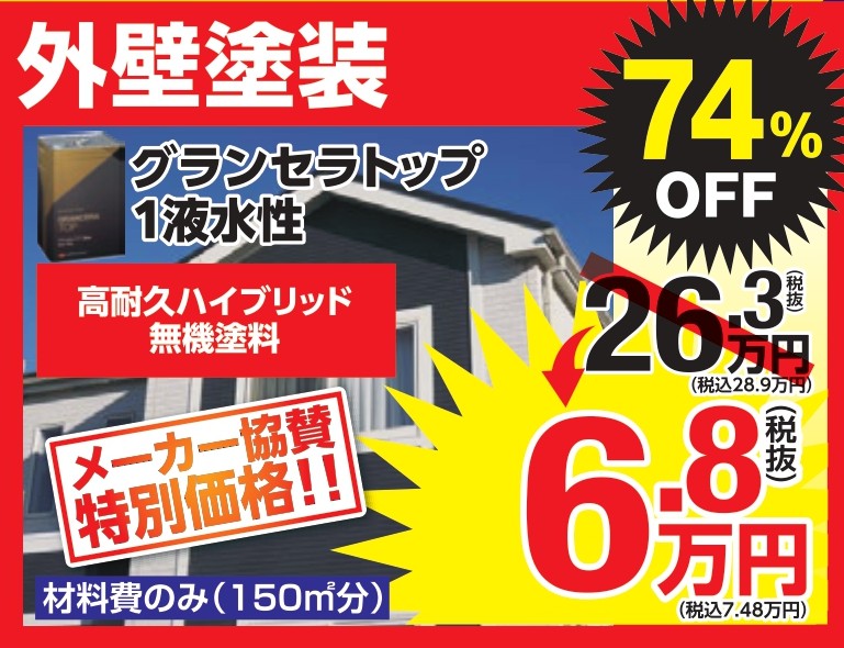 ■ 高耐久ハイブリット無機塗料の外壁塗料が74%OFF!