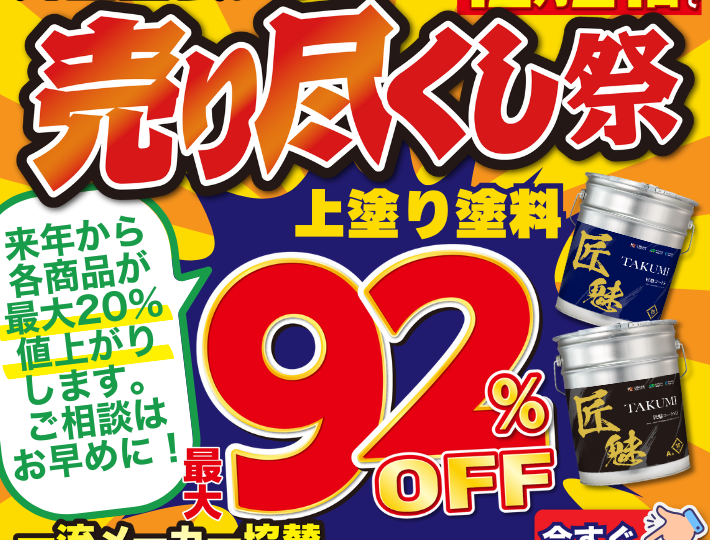 秋が深まり、外壁や屋根の劣化が気になり始める季節になりました。 「そろそろ塗装を考えたいけど、費用が心配…」 「どこに相談すればよいのか迷っている」 そんな方へ、お得なご案内です。 プロタイムズ宇都宮店・鶴田店では、年内最後の大イベントとなる「売り尽くしセール」を開催しています。 メーカー協賛の特別割引により、人気塗料が最大92%OFFとなる、大変お得なキャンペーンです! 最大92%OFF!数量限定のスペシャル価格 今回の売り尽くしセールでは、以下の人気塗料・住宅設備を数量限定の特別価格にてご提供いたします! ■ 人気の外壁塗料が92%OFF! プレミアムシリコン(エスケー化研) / スーパーラジカルシリコン(アステックペイント) 通常11.6万円(税抜き)が92%OFFで、なんと0.35万円(税抜き)でご提供♪   ■ 遮熱塗料シェアNo.1のアステックペイントの屋根塗料が81%OFF! スーパーシャネツサーモSi(アステックペイント) 通常9.5万円 (税抜き)が81%OFFで、なんと 1.8万円(税抜き)でご提供♪   ■ 高耐久ハイブリット無機塗料の外壁塗料が74%OFF! グランセラトップ 1液水性(日本ペイント) 通常26.3万円(税抜き)が74%OFFで、なんと 6.8万円(税抜き)でご提供♪   ■ トイレが60%OFF(本体)! トイレ(INAX アメージュ便器+KAシリーズ) 通常25.4万円(税抜き)が60%OFFで、なんと10.2万円(税抜き)でご提供♪ これらの割引はメーカー協賛があってこそ実現した内容ですので、数量限定・先着順でのご案内となります! ハウスメーカー住宅にお住まいの方は「お見積り特典」あり! 今回のセールでは、ハウスメーカー住宅にお住まいの方限定で、うれしい特典をご用意しています。 【ご来店+お見積り特典】 5,000円分の商品券をプレゼント! 対象ハウスメーカー例: 積水ハウス ダイワハウス ヘーベルハウス 住友林業 ミサワホーム ・・・etc. まずは状態だけ知りたい方も大歓迎です! お気軽にご相談下さい☺ 無料の建物診断で現状をしっかりチェック プロの建物診断が無料で受けられます。 ドローン撮影で屋根の状態を安全に確認 外壁のひび割れや防水劣化を丁寧にチェック 写真付き報告書で分かりやすくご説明 「本当に今塗装が必要か」を見極めるためにも、診断だけでもお気軽にご利用ください。 塗装工事は“一生のお付き合い”。施工品質にこだわります 外壁や屋根の塗装は、ただ色を塗るだけではありません。 下地処理、ひび割れ補修、防水作業など、住まいの寿命を左右する重要な工程があります。 当店では、施工管理スタッフが工程ごとに品質チェックを実施し、完工後は詳細な写真付きの施工完了報告書でご報告いたします。 また日々のご報告は、【塗り替え交換日記】でやり取り! 些細なことでもご不安点を解消するべく、精一杯取り組ませていただいています。 「安心して任せられる塗装店」を目指し、長くお付き合いできる体制を整えています。 人気の通常プランも充実しています 高耐候フッ素プラン 無機塗料プラン 遮熱+高耐久プラン シリコン標準プラン デザイン性重視の多彩仕上げ ご希望とご予算に合わせて最適なプランをご提案いたします。 外壁・屋根以外のリフォーム相談もできます 今回のセールでは、住宅全般のリフォーム相談も承っています! トイレ交換 浴室リフォーム キッチン入れ替え クロス張り替え 雨樋交換 外構工事 他にも住まいの気になることは、何でもお気軽にご相談ください。 施工事例も多数掲載中 宇都宮市・鹿沼市・さくら市を中心に、多くの外壁塗装・屋根塗装工事を手がけています。 ハウスメーカー住宅の施工実績も豊富で、外壁材に応じた最適な施工が可能です。 ご来店の際には、施工事例の写真もあわせてご紹介いたします。 まとめ:今年最後の大チャンス!まずはお気軽にご相談ください 今回の売り尽くしセールは、年内最大級の内容となっております。 人気商品が最大92%OFFの特別割引! お見積り特典!ハウスメーカー住宅限定商品券5,000円 塗装のベストタイミングは、建物の状態によって異なります。 まずは無料診断だけでもお気軽にお問い合わせください。 皆さまのご来店を心よりお待ちしております!